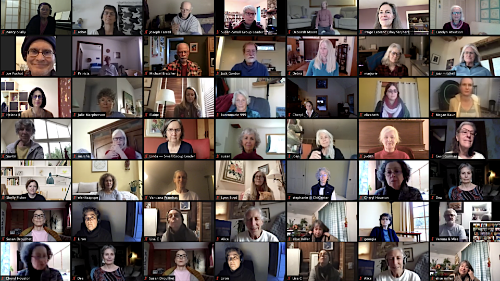 A virtual gathering of diverse individuals participating in an online meeting, displayed in a grid format, showcasing a sense of connection and community across various personal spaces.