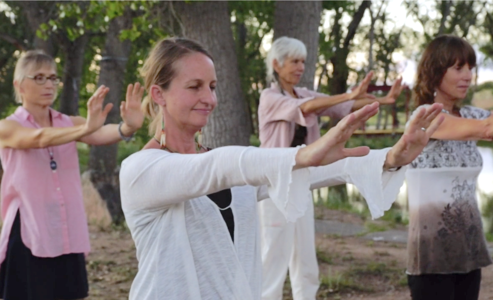 A group of women practicing Qigong outdoors in a serene forest setting. The focus is on a woman in the foreground wearing a white cardigan with flowing sleeves, her arms extended in a graceful posture. Other participants, including women of varying ages, are aligned in the background, all engaged in the practice. The scene is peaceful, with trees and soft natural light enhancing the atmosphere.