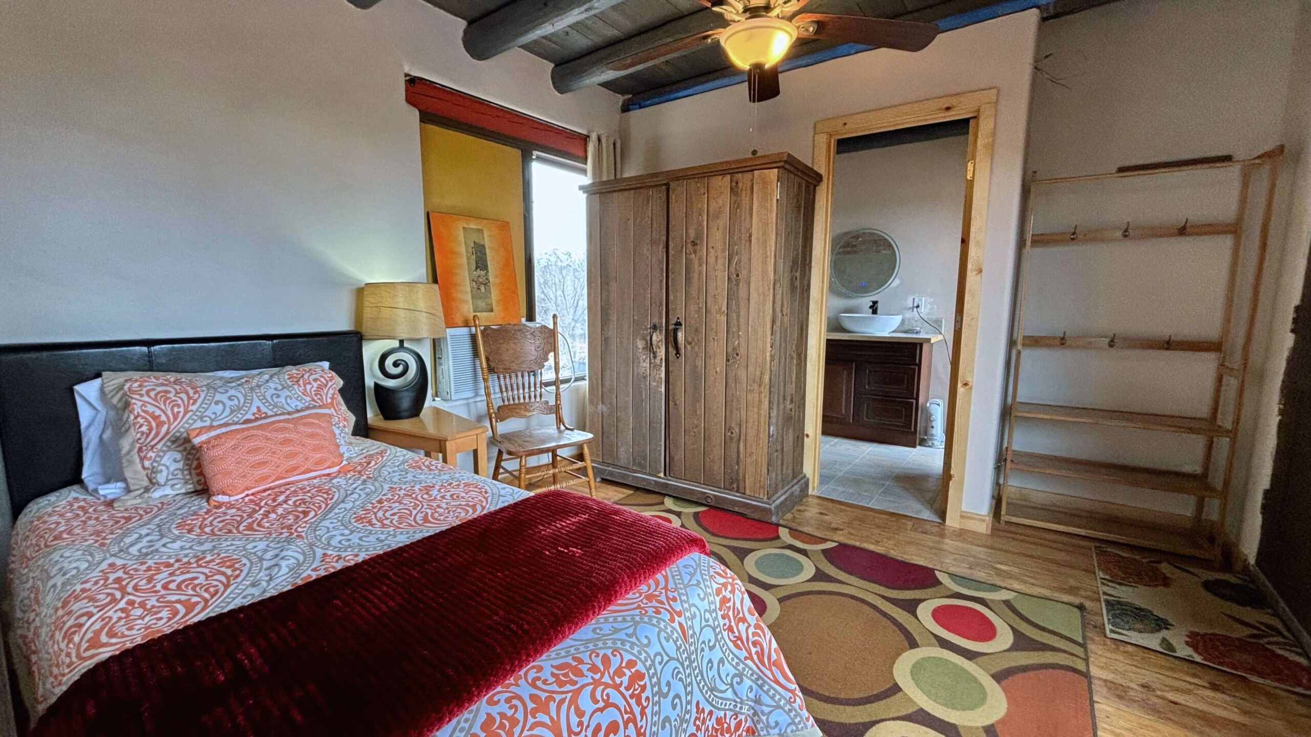 The campus lies on 150 acres of somewhat hilly terrain. There is a road as well as a walking trail between the rooms and the main house where meals are served. The road is lit at night for safe passage. It is approximately a 5-minute walk to and from most of the guest rooms and the main house. Please bring closed toed shoes for walking and hiking in desert terrain.