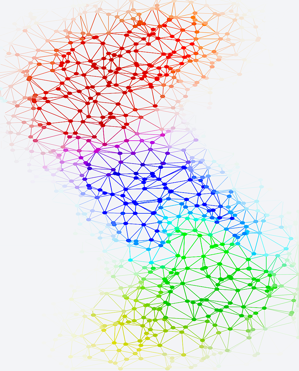 An abstract illustration of interconnected nodes and lines, transitioning in vibrant colors from red to green, symbolizing networks, connections, and collaboration.
