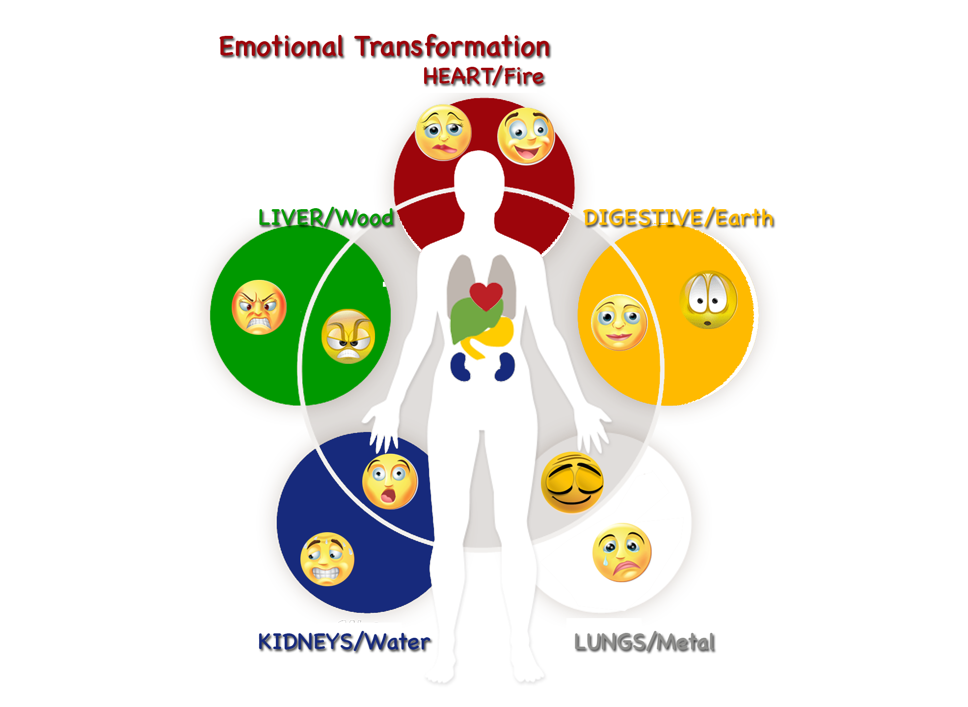Illustration of Emotional Transformation in Wisdom Healing Qigong showing the connection between the five elements (Heart/Fire, Liver/Wood, Digestive/Earth, Kidneys/Water, and Lungs/Metal) and their associated emotions, represented with emojis, placed on a human body outline for visualization.