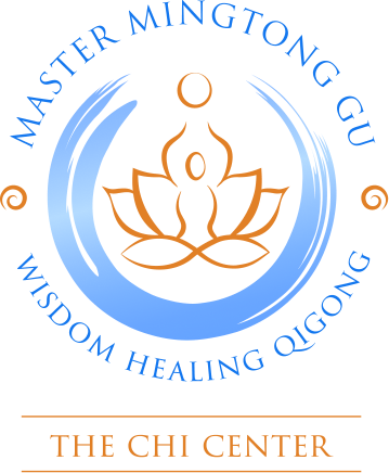 Logo for The Chi Center featuring 'Master Mingtong Gu, Wisdom Healing Qigong' in blue and orange, with a lotus and circular design at the center.