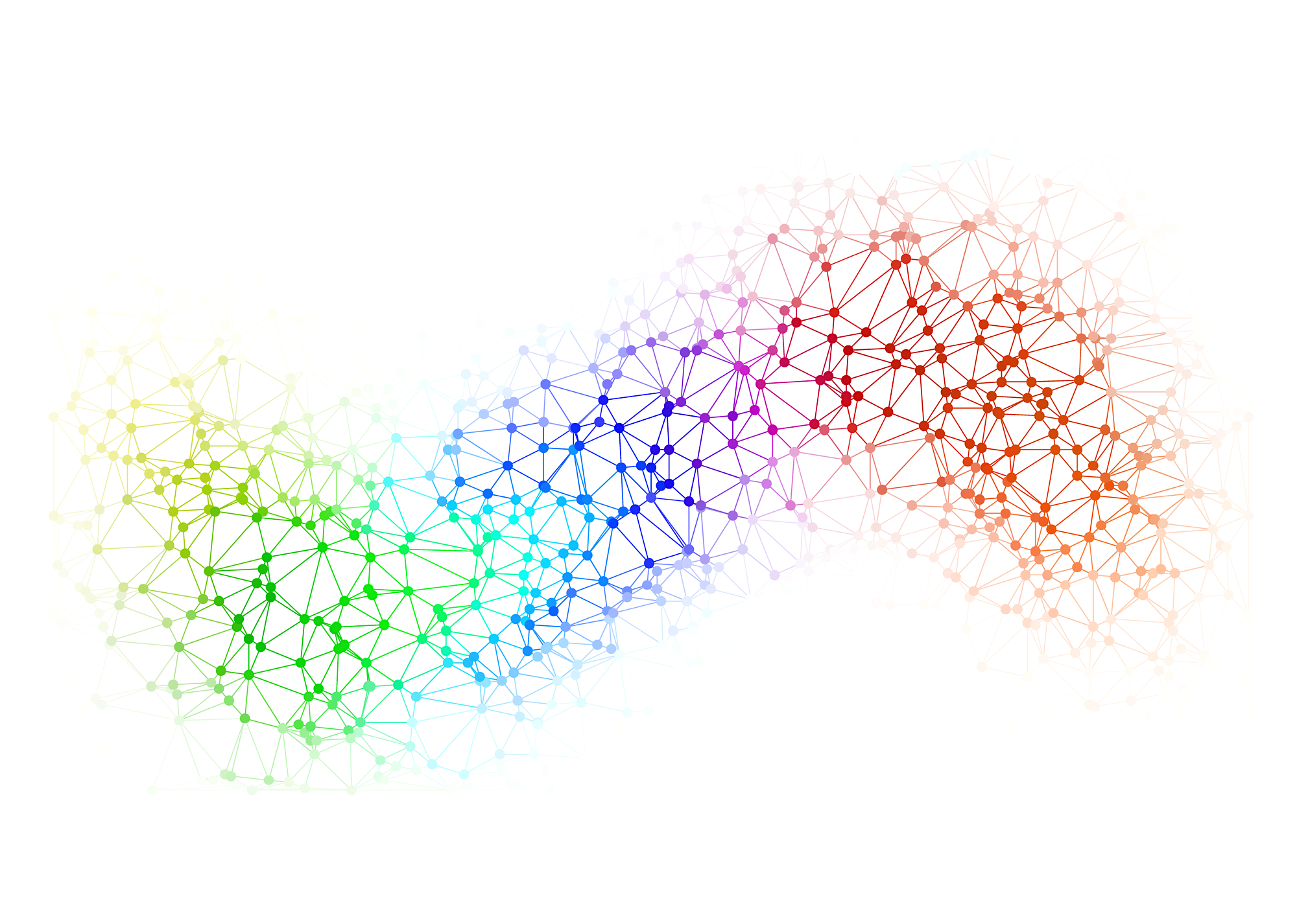 An abstract illustration of interconnected nodes and lines, transitioning in vibrant colors from red to green, symbolizing networks, connections, and collaboration.
