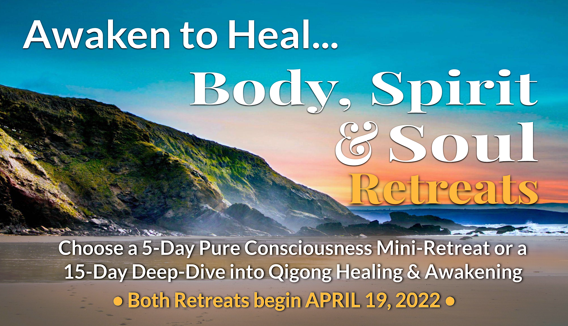 Promotional image for 'Awaken to Heal: Body, Spirit & Soul Retreats,' offering a choice between a 5-day Pure Consciousness Mini-Retreat and a 15-day deep dive into Qigong Healing & Awakening. Both retreats begin on April 19, 2022. Features a tranquil coastal landscape with cliffs, a sandy beach, and a vibrant sunset, symbolizing healing, transformation, and spiritual renewal.