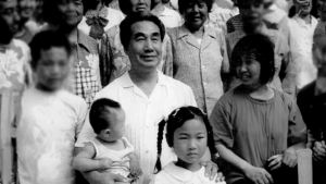 Dr. Pang surrounded by children in a black-and-white group photo, reflecting his connection to community and his dedication to sharing Qigong.