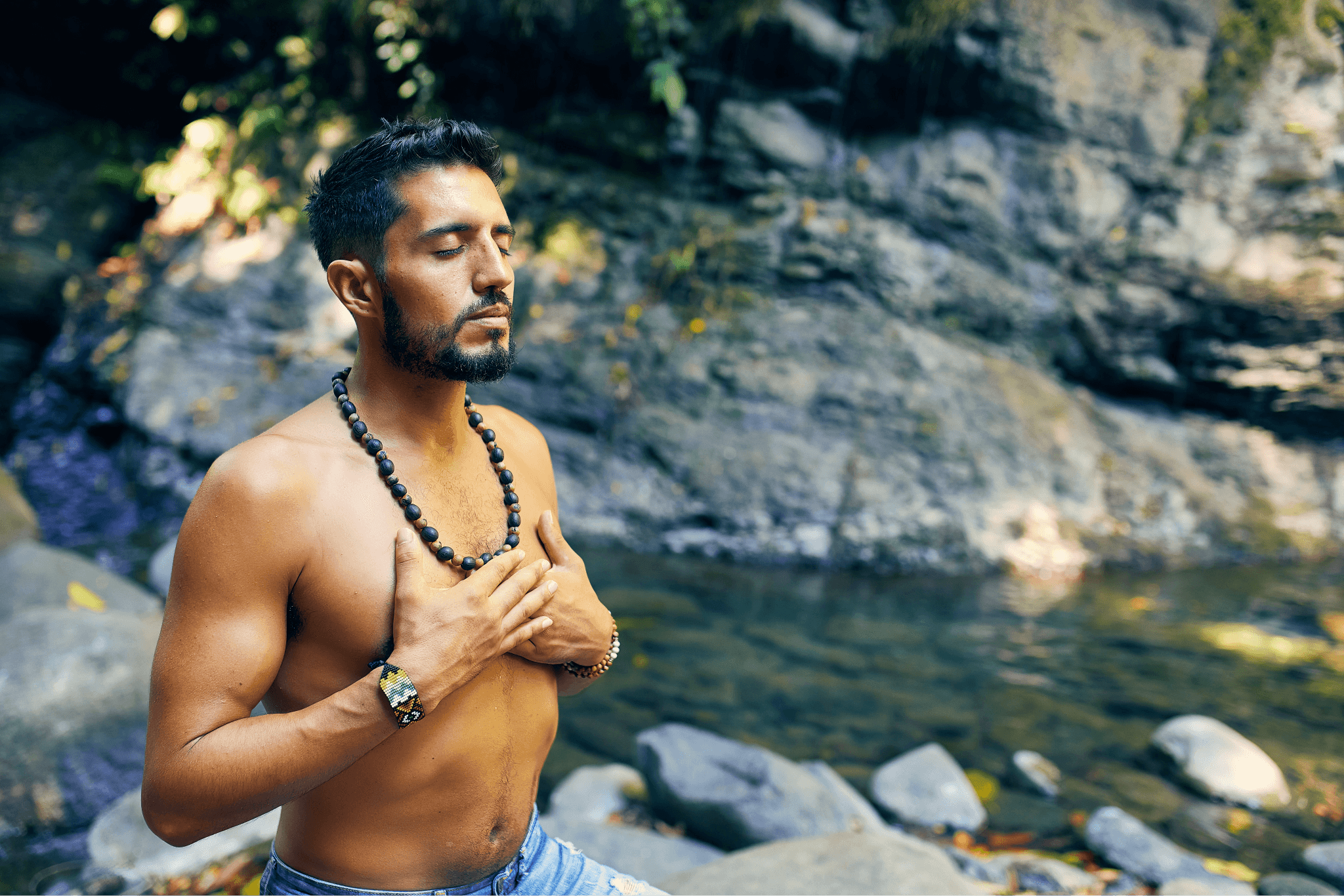 Man meditating by a serene river with hands on his chest, embracing mindfulness and connection to nature.