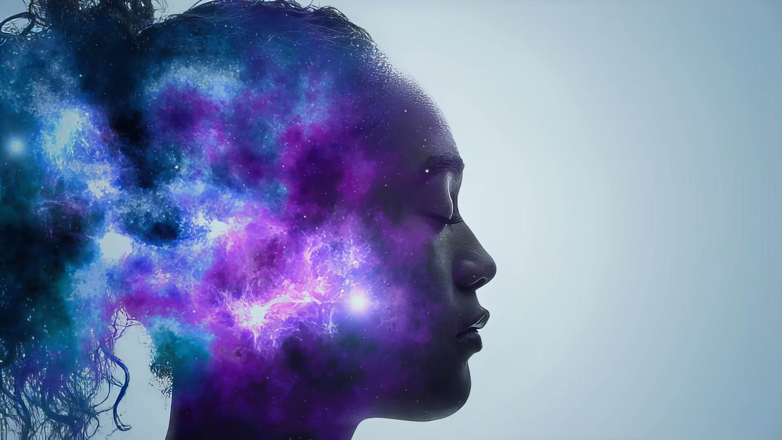 Silhouette of a woman's profile with her eyes closed, blending into a vivid, cosmic nebula filled with shades of purple, blue, and bright white stars. This image represents the connection between inner consciousness and the universe, symbolizing the boundless energy and potential within the human mind.