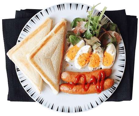 Plate of breakfast food featuring toasted sandwich bread, boiled eggs, fresh greens, and sausages topped with ketchup, presented on a white plate with black patterned edges.