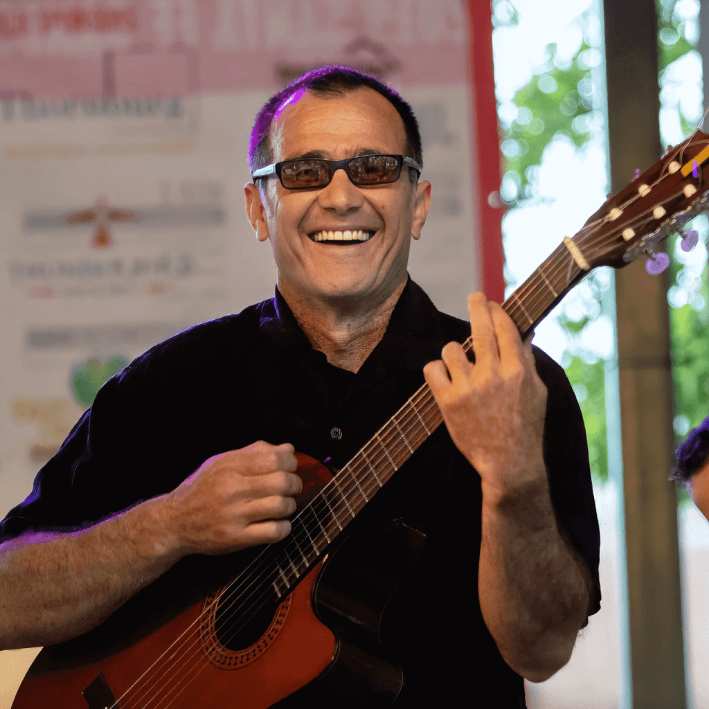 Michael Manzanares is pictured with a radiant smile as he plays the guitar, fully immersed in the joy of music. He wears dark sunglasses and a black shirt, giving him a cool, relaxed presence on stage. The background suggests a lively, open-air setting, with soft lighting enhancing his enthusiastic expression. His hands skillfully hold the guitar, capturing his passion and warmth in sharing his music with the audience.