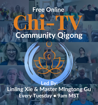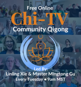 Promotional graphic for 'Chi-TV Community Qigong,' a free online event led by Linling Xie & Master Mingtong Gu every Tuesday at 9am MST.