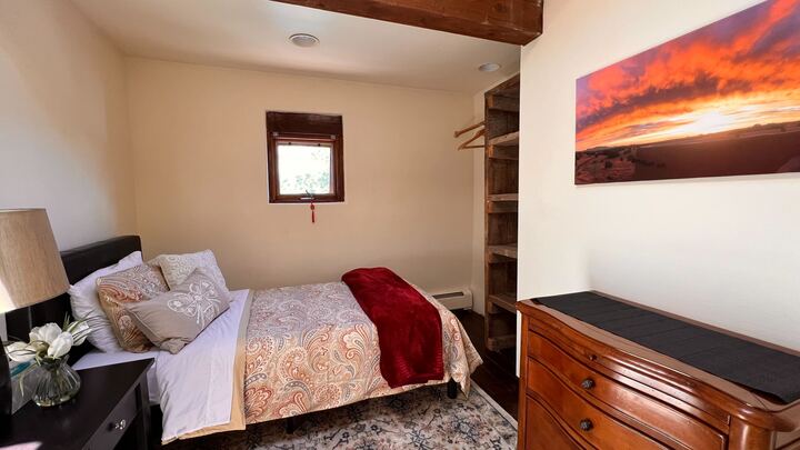 Zia #3 Skylight Room - A cozy bedroom featuring a single bed with plush pillows, a red blanket, wooden shelving, and a skylight window. Warm decor with natural wood tones and soft lighting for a peaceful stay.