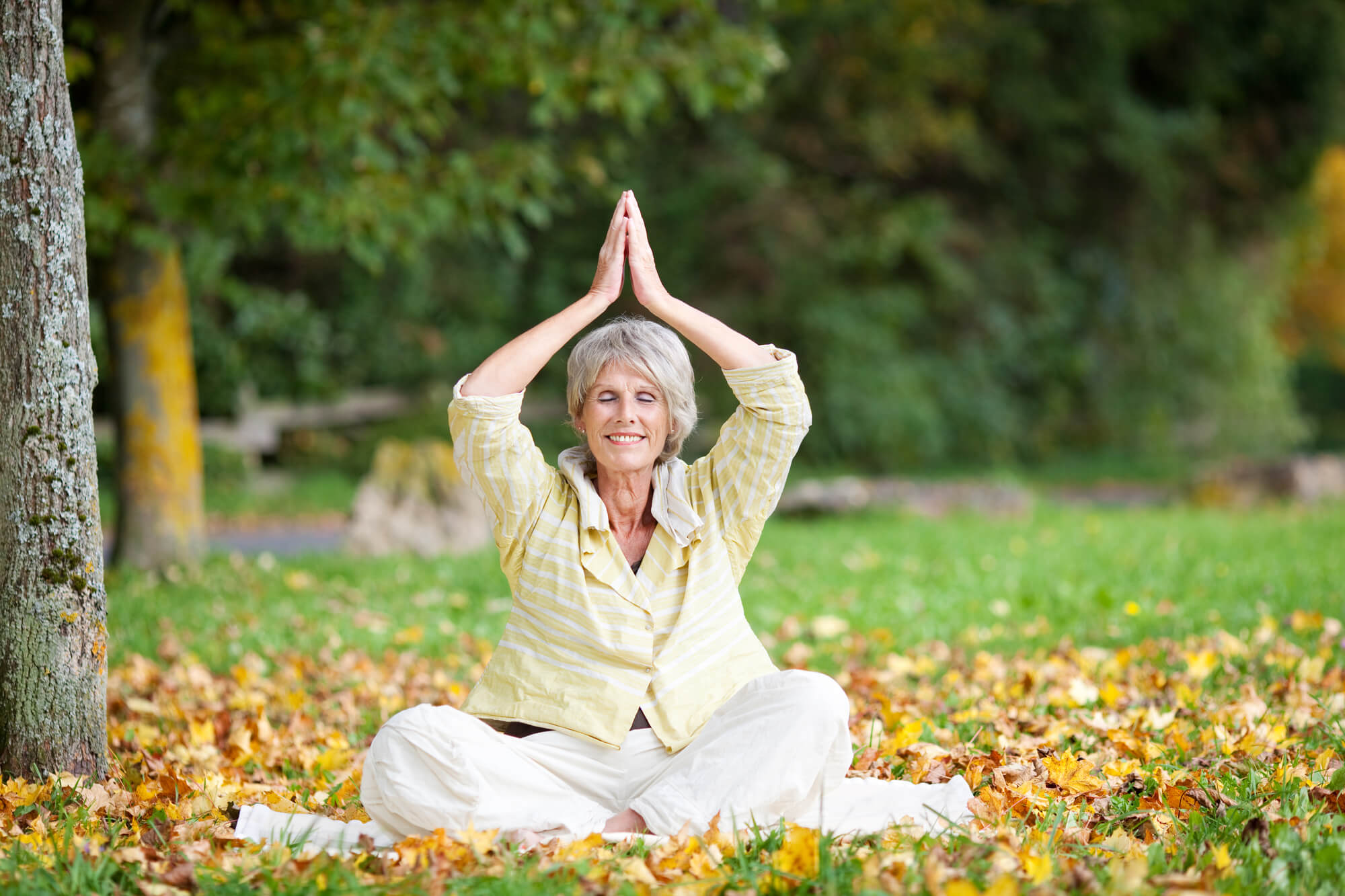 A woman practicing Qigong in a serene park, surrounded by fallen autumn leaves, embodying the essence of Life Mastery.