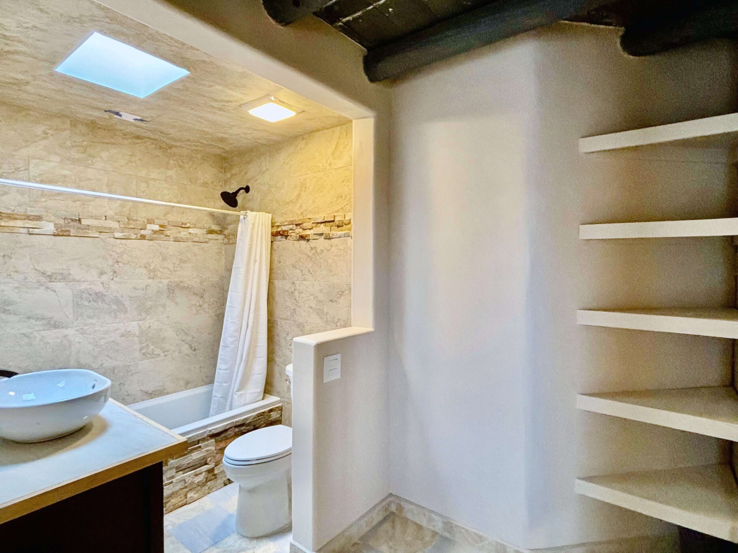 Modern bathroom in a loft room at The Chi Center, designed to complement Wisdom Healing Qigong practice with a serene and clean atmosphere. The bathroom features beige stone tiles, a shower with a white curtain, a vessel sink on a wooden countertop, and built-in white shelves. Skylights provide natural light, enhancing the calm and inviting space.