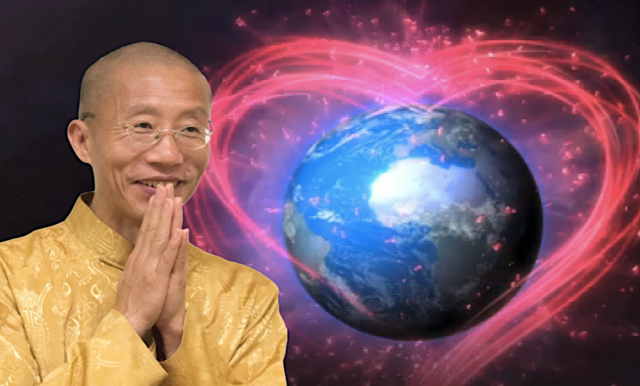 An image of Master Mingtong Gu wearing a golden traditional outfit, with his hands in a prayerful gesture and a serene smile. Behind him, a glowing Earth is encircled by radiant pink heart-shaped energy waves, representing love, healing, and global connection.