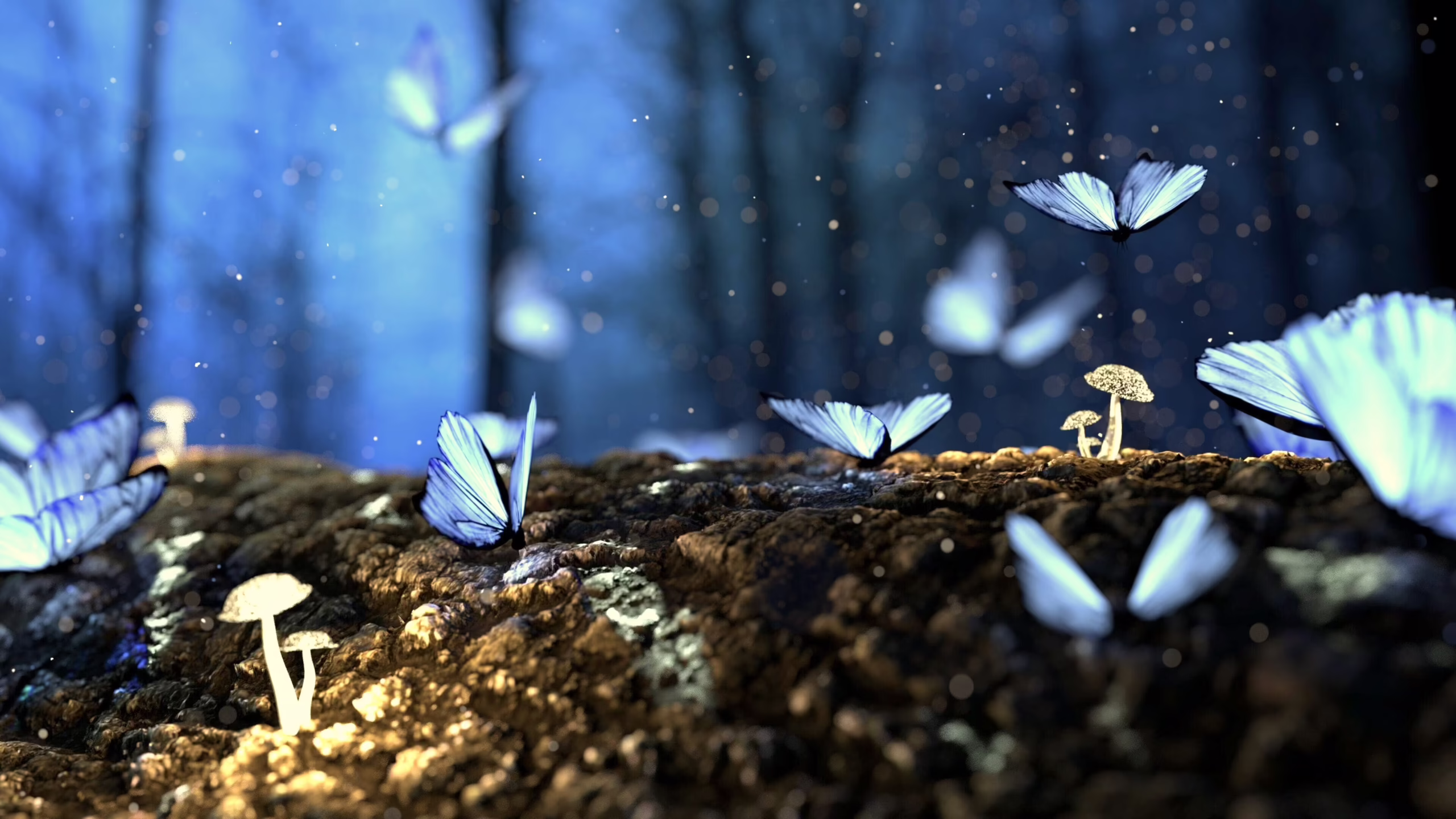 A magical forest scene with glowing white mushrooms sprouting from the forest floor, surrounded by delicate blue butterflies fluttering in the air against a blurred, twilight backdrop. Tiny glowing particles add a sense of enchantment to the atmosphere.