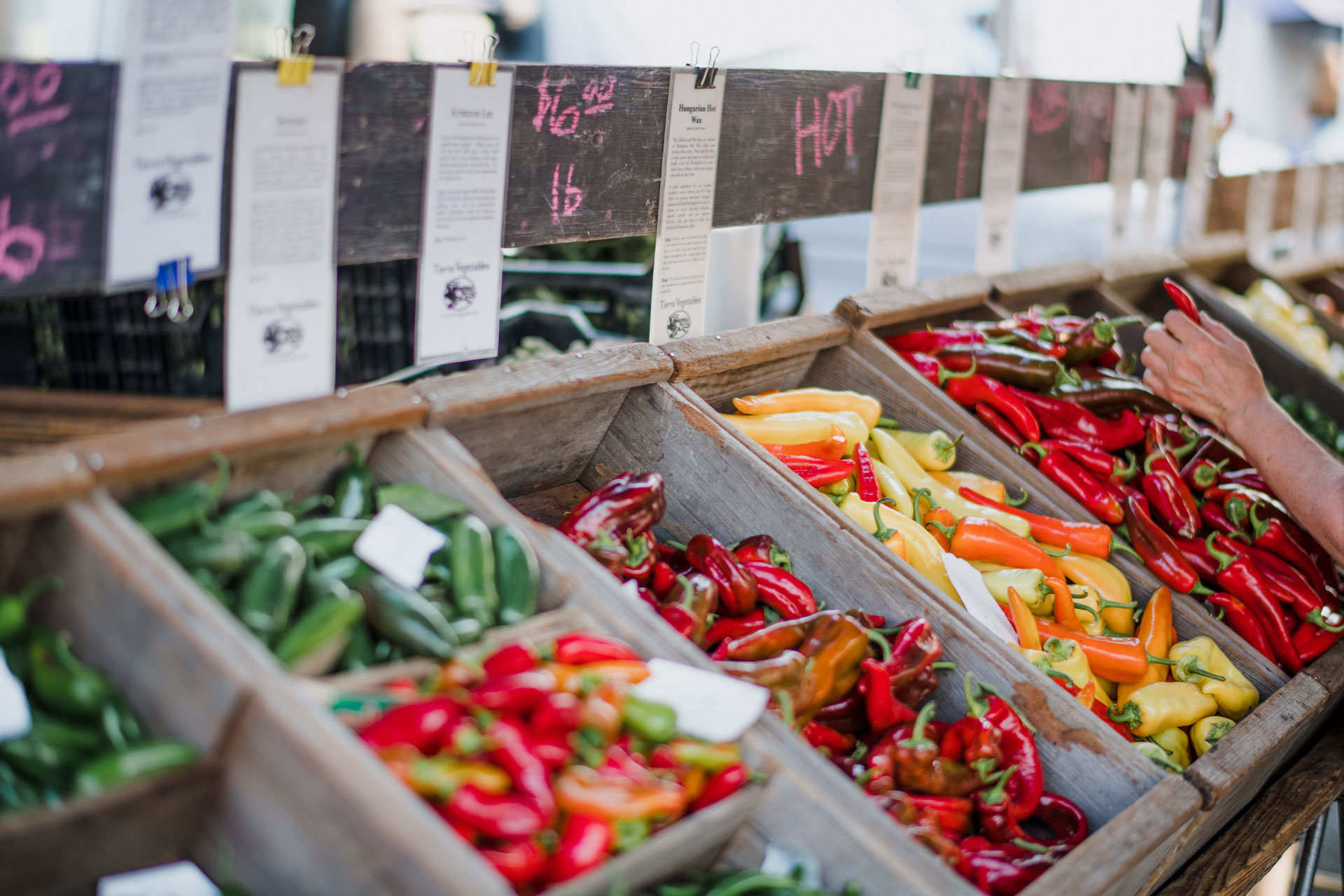 An assortment of colorful peppers, including green, red, yellow, and orange varieties, is displayed in rustic wooden crates at a farmer's market. Small signs with descriptions are clipped above the crates, and a hand reaches in to pick one of the vibrant peppers. The scene captures the fresh, lively atmosphere of a local market.