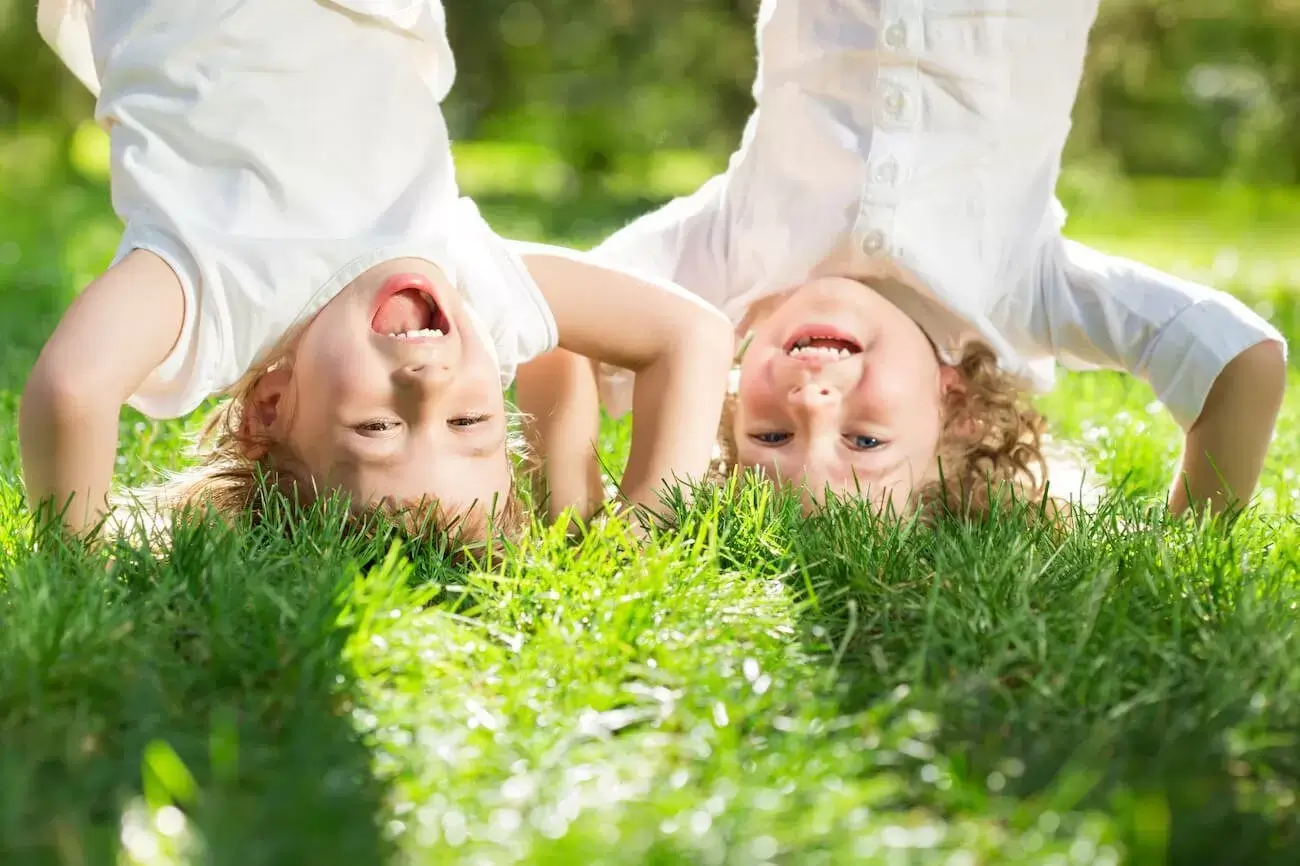 Two children playfully hanging upside down on a grassy lawn, laughing and enjoying a sunny day.