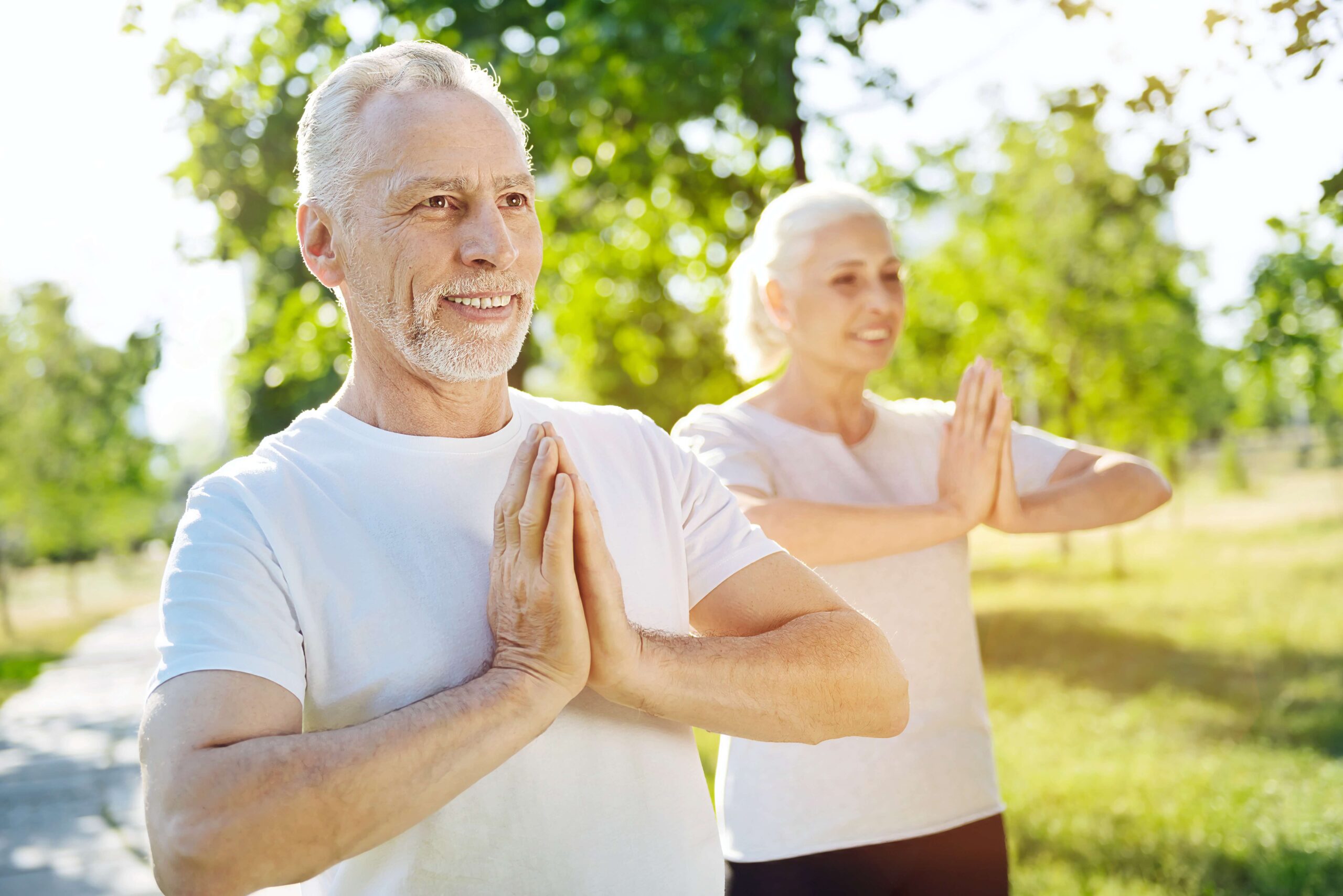 Smiling senior couple practicing yoga or meditation outdoors in a sunny park, standing with hands in a prayer position.