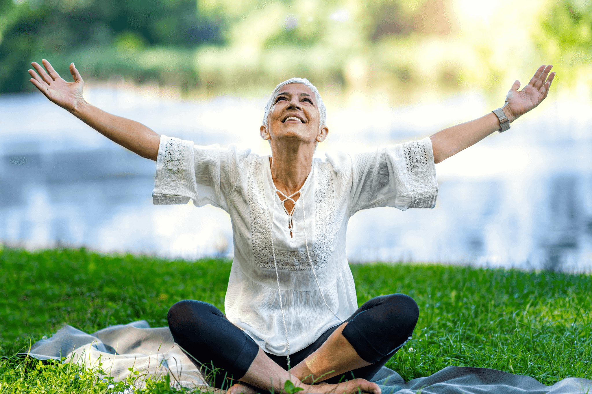 Joyful woman sitting cross-legged on grass with arms outstretched, looking up with a peaceful smile, surrounded by a serene outdoor setting near water.