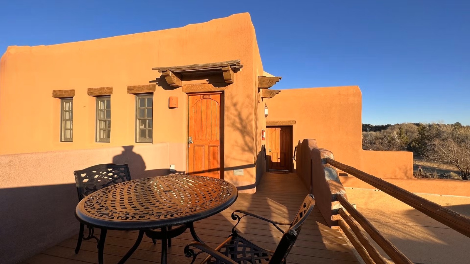 Sunny outdoor terrace of a Southwestern adobe-style building with a decorative metal table and chairs, wooden doors, and a scenic view of trees and clear blue skies.