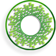A circular green logo with a dynamic design of radiating rectangular shapes forming a spiral pattern around a central black void. The gradient of green shades creates a sense of energy and motion, symbolizing growth, vitality, or connectivity.