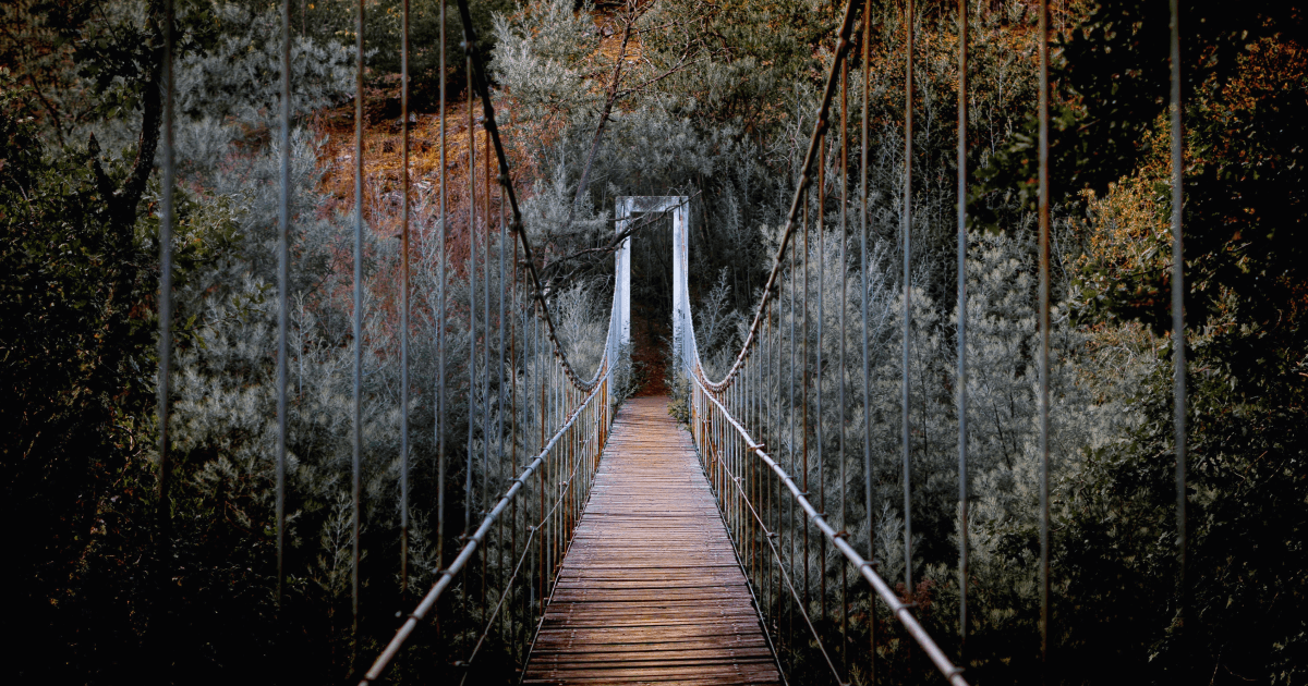 A rustic wooden suspension bridge stretches across a tranquil forest setting, shrouded in a serene mist. The bridge, framed by silver-toned foliage, symbolizes the journey of self-love, spirituality, and the quest for health and well-being, aligning with the practices of Wisdom Healing Qigong that emphasize balance and harmony with nature.