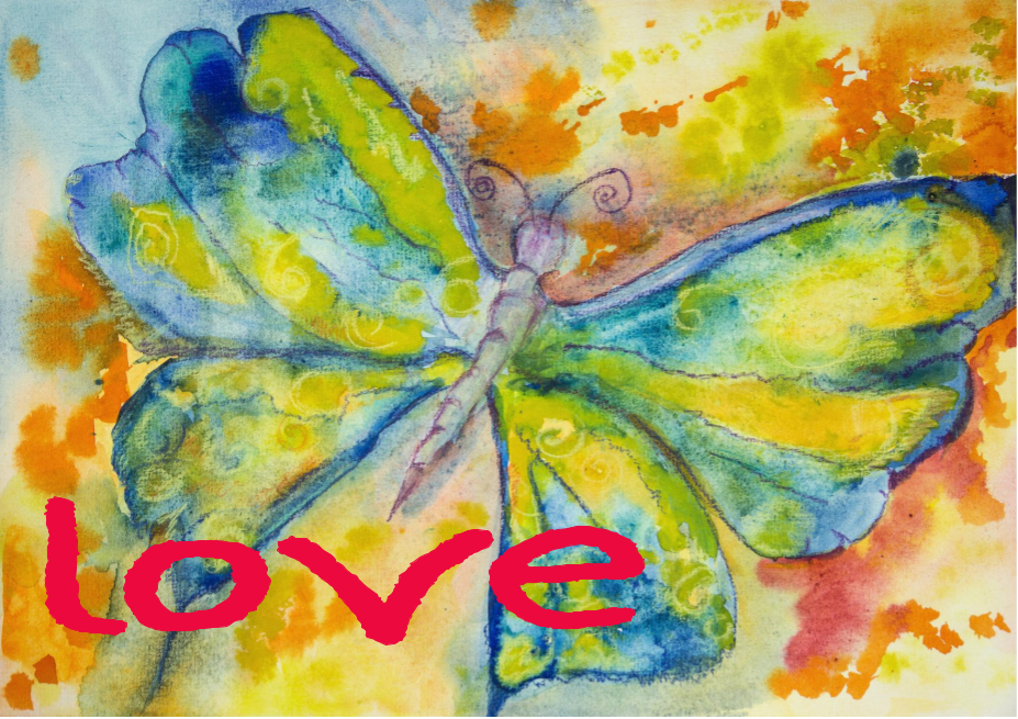 Watercolor painting of a butterfly with vividly patterned wings in blue, green, and yellow hues, set against a dynamic splattered orange and yellow background, conveying a sense of movement and vibrancy.