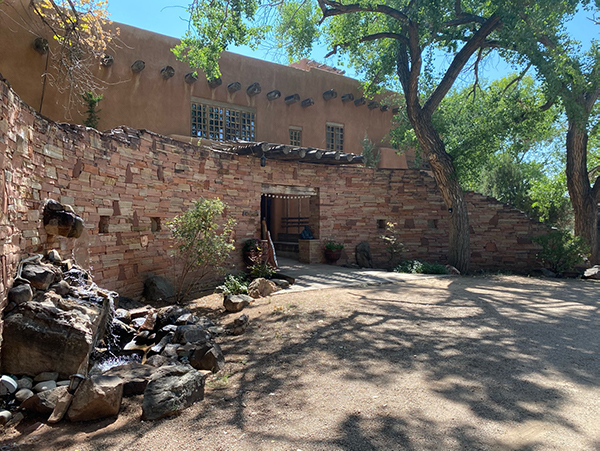The image showcases a serene courtyard at The Chi Center, featuring an adobe-style building with large windows and traditional wooden beams.