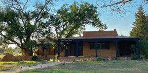 Front view of The Ranch House at The Chi Center, featuring traditional adobe design, shaded porch, and surrounded by lush trees and serene natural landscape.
