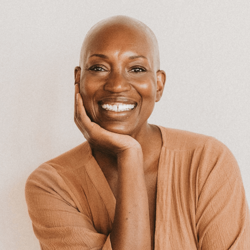 Portrait of Tracee Stanley, captured with a warm and radiant smile as she gently rests her face on her hand. Her joyful expression exudes a sense of calm and presence. She wears an earthy-toned top, set against a neutral background, creating a serene and grounded atmosphere.