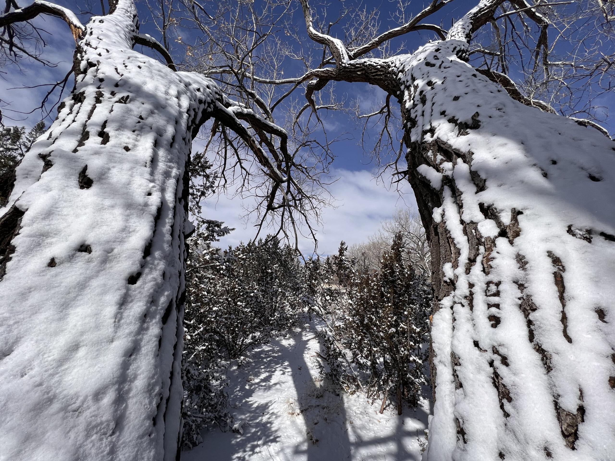 Snow-covered trees framing a serene winter pathway under a bright blue sky, showcasing the beauty of a peaceful snowy landscape.