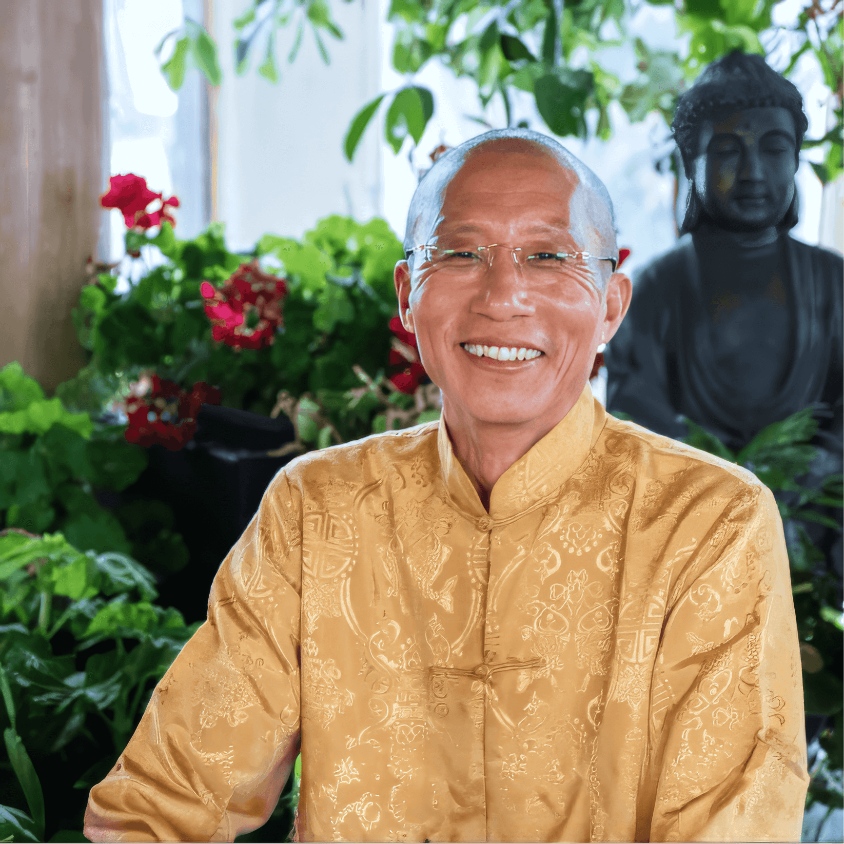 A warm portrait of Master Mingtong Gu, dressed in a beautifully detailed golden traditional garment, exuding a sense of peace and joy. His gentle smile and clear, compassionate gaze convey kindness and wisdom. He is surrounded by lush green plants and vibrant red flowers, with a serene Buddha statue in the background, adding a spiritual ambiance to the setting. This image captures Master Mingtong Gu’s connection to nature, mindfulness, and his role as a guide in healing and spiritual growth.